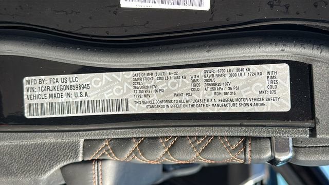 Electronic Limited Slip Differential Delete (Conventional Differential Rear Axle), Quick Order Package 22S, Two Tone Paint Group, 10 Speakers, 3.45 Rear Axle Ratio, 3rd row seats: split-bench, 4-Wheel Disc Brakes, ABS brakes, Active Noise Control System, Adaptive suspension, Air Conditioning, Alloy wheels, AM/FM radio: SiriusXM with 360L, Anti-whiplash front head restraints, Audio memory, Auto High-beam Headlights, Auto-dimming door mirrors, Auto-dimming Rear-View mirror, Auto-leveling suspension, Automatic temperature control, Brake assist, Bumpers: body-color, Compass, Delay-off headlights, Driver door bin, Driver vanity mirror, Dual front impact airbags, Dual front side impact airbags, Electronic Stability Control, Emergency communication system, Four wheel independent suspension, Front anti-roll bar, Front Bucket Seats, Front Center Armrest w/Storage, Front dual zone A/C, Front fog lights, Front reading lights, Fully automatic headlights, Garage door transmitter, Genuine wood dashboard insert, Genuine wood door panel insert, Heated door mirrors, Heated front seats, Heated rear seats, Heated steering wheel, Illuminated entry, Knee airbag, Leather steering wheel, Low tire pressure warning, Memory seat, Nappa Leather Seats, Navigation System, Normal Duty Suspension, Occupant sensing airbag, Outside temperature display, Overhead airbag, Overhead console, Panic alarm, Passenger door bin, Passenger vanity mirror, Power door mirrors, Power driver seat, Power Fold Seatbacks, Power Liftgate, Power moonroof, Power passenger seat, Power steering, Power windows, Radio data system, Radio: Uconnect 5 Nav w/10.1 Display, Rain sensing wipers, Rear air conditioning, Rear anti-roll bar, Rear dual zone A/C, Rear reading lights, Rear seat center armrest, Rear window defroster, Rear window wiper, Reclining 3rd row seat, Remote keyless entry, Security system, Speed control, Speed-Sensitive Wipers, Split folding rear seat, Spoiler, Steering wheel memory, Steering wheel mounted audio controls, Tachometer, Telescoping steering wheel, Tilt steering wheel, Traction control, Trip computer, Turn signal indicator mirrors, Variably intermittent wipers, Ventilated front seats, Voltmeter, and Wheels: 20 x 8.5 Fully Painted Aluminum Silver At Michael Hohl Motor Company it is all about you!!! Come see us for a no hassle, no pressure buying experience. Serving all of Nevada and Northern California since 1984.